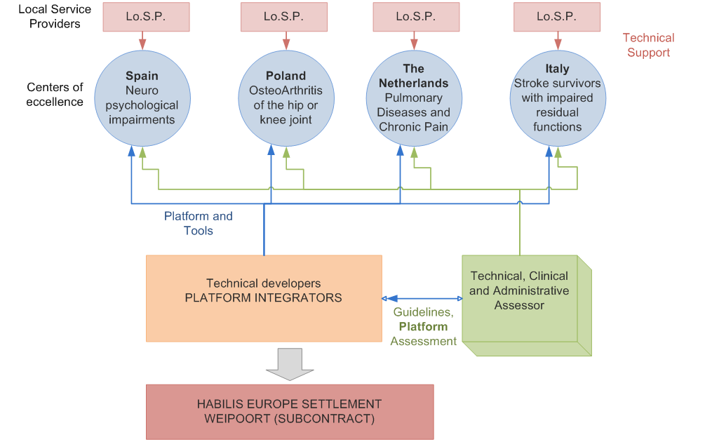 The diagram shows the role of each partner within the project. The different competencies will strongly benefit the need for a common approach in the deployment of the service at an European level. A constant upgrade of the platform is made by the Technical developers to each clinical center while the Assessors will evaluate the impact of the service in the different countries.